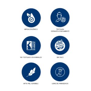 Hipoalergénica – Apta piel sensible – Testeada dermatológicamente – Sin parabenos – Sin TACC – No testeada en animales