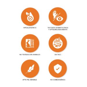 Hipoalergénica – Apta piel sensible – Testeada dermatológica y oftalmológicamente – Sin TACC – Sin parabenos – No testeado en animales