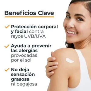 - Crema-gel de textura liviana protege contra las alergias y los daños ocasionados por el sol.